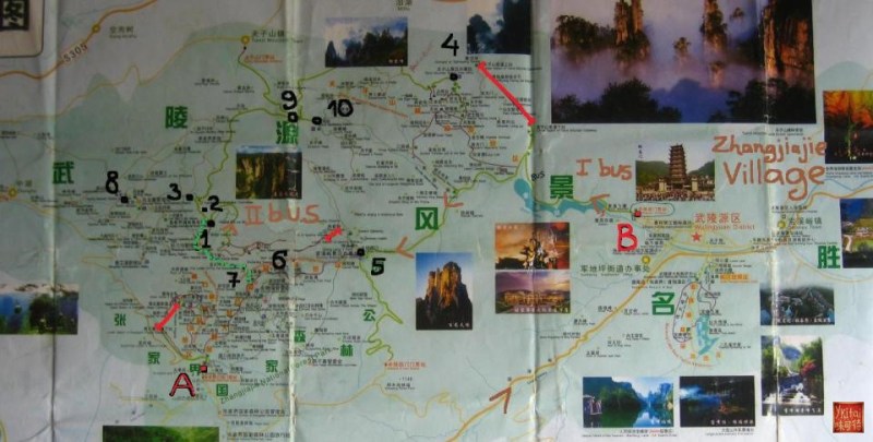 Как вы уже поняли, существуют 2 входа в парк, обозначенных на картах в этой статье как А (вход “Чжанцзяцзе”) и В (вход “Улинъюань”) и еще один, “задний”, северный.