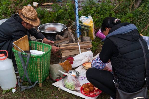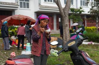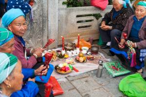 Вышли мы из гостиницы в дождливый день (на гору не взобраться, а до пагод надо было пройтись пешком), а там на тротуарах люди костры разложили. Хм.. странное место, чтобы еду в обеденный перерыв готовить. Но потом все оказалось намного более странным (порой даже чуть-чуть страшным). Это какой-то местный языческий праздник, связанный с предками, с загробным миром. Все тротуары плотно усыпаны китайцами (вернее, бай – еще одно национальное меньшинство).