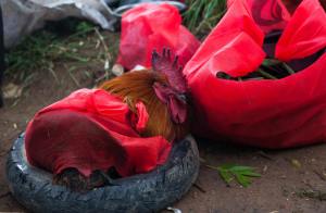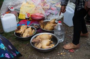 К кострам прилагается еще и еда. ВЕЗДЕ убивают петухов. Они рядом с кострами уныло ждут своей участи, их там же убивают, потрошат, ощипывают и кладут варить прямо с головой и ногами. Туда же отправляется большой шмат свинины. Кругом много вареных яиц. Рис. Яблоки. Ну и конечно, соусы.