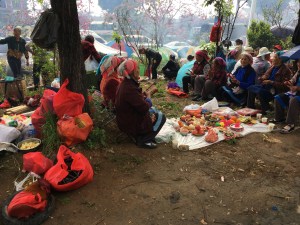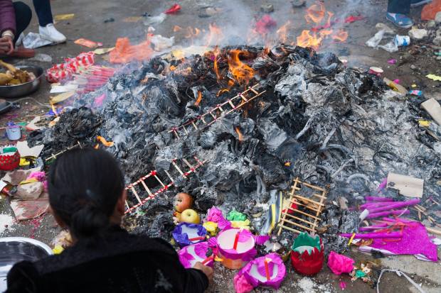 Все они нарисовали мукой или рисом замысловатые круги, выложили радиусами какие-то зеленые палки или лук, и внутри этих кругов жгут костры. Жгут все: еду, бумагу. Особенно примечательно, что бумага не просто бумага, она вырезана в форме одежды, обуви, машин, сотовых телефонов, денег. Таким образом передается посылка на тот свет (усопшим, чтобы жизнь у них там была лучше).